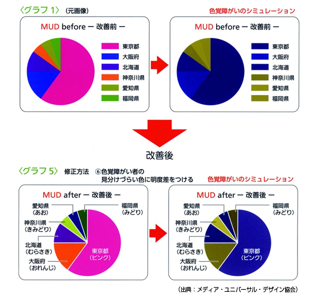人は情報の8割以上を視覚から得ていると言われており、社会には新聞やテレビなど目で見るメディアがあふれていますが、視覚・色覚に障がいがある方、高齢の方、外国人の方など、情報を得るための視覚的課題を持つ方がいらっしゃいます。MUDとは誰にでも使いやすく、見えやすいように配慮されたデザインのことです。